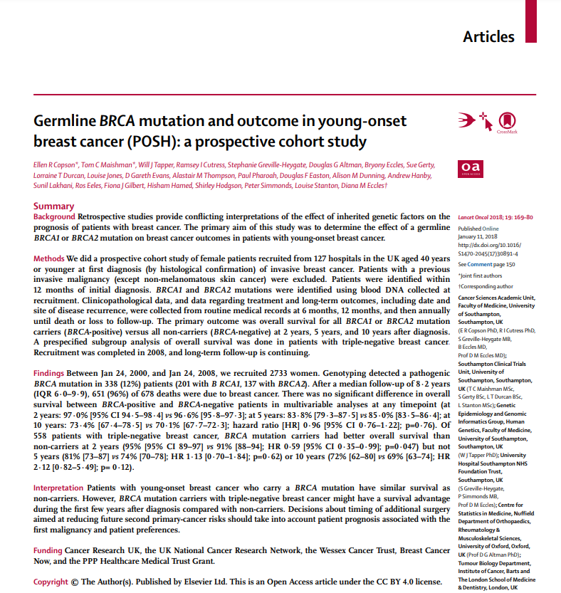 Germline BRCA mutation and outcome in young-onset breast cancer (POSH): a prospective cohort study (2018)View DocumentFavorite